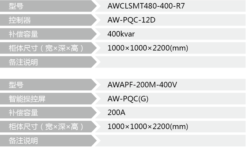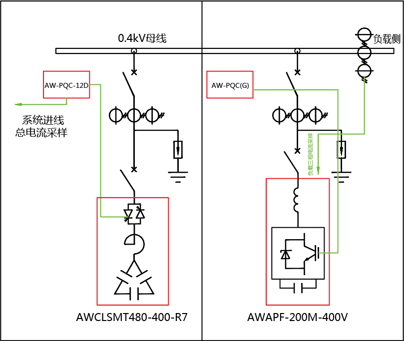 注:配电变压器容量为1000KVA,总补偿容量为400KVAR,由8个50KVAR支路组成;总滤波容量200A,由2个100A有源滤波模块组成。