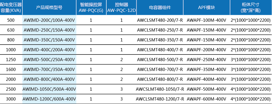 AWIMD系列低压智能型无功补偿方案主要由AWAPF系列有源电力滤波器和AWCLT系列低压无功补偿两部分组成,其中AWAPF系列有源电力滤波器负责滤除系统中的谐波,AWCLT系列低压无功补偿组件负责提供给系统容性无功功率。本方案主要适用于谐波含量较大,需求大量无功,负荷变化较稳定的供配电系统(如污水处理厂变频器等非线性设备较多)。